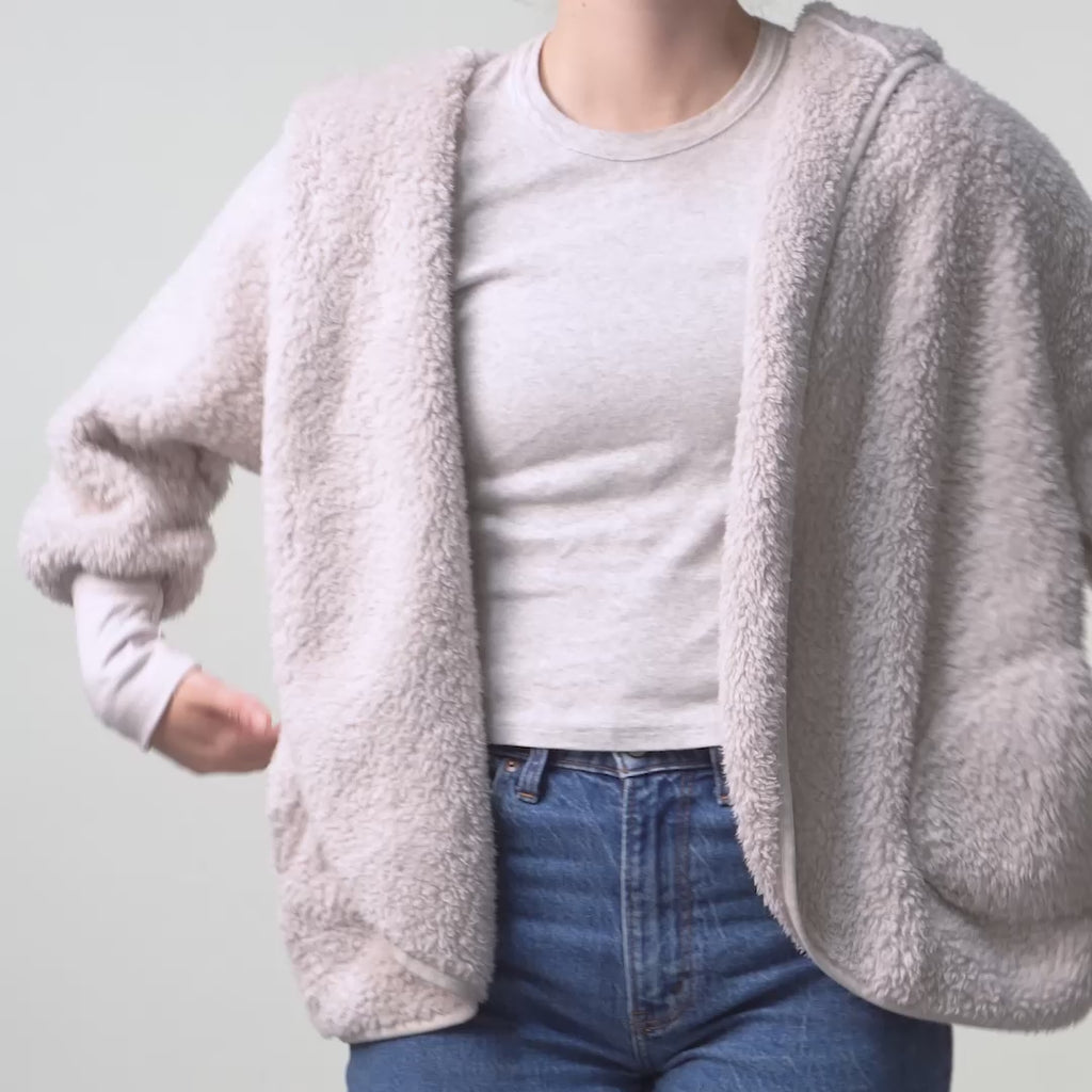 Create your comfort zone anywhere. This super plush faux sherpa cardigan is perfect for lounging at home, beating office AC and cozy travel! Designed for instant comfort with an oversized hood and snuggle-worthy side pockets.