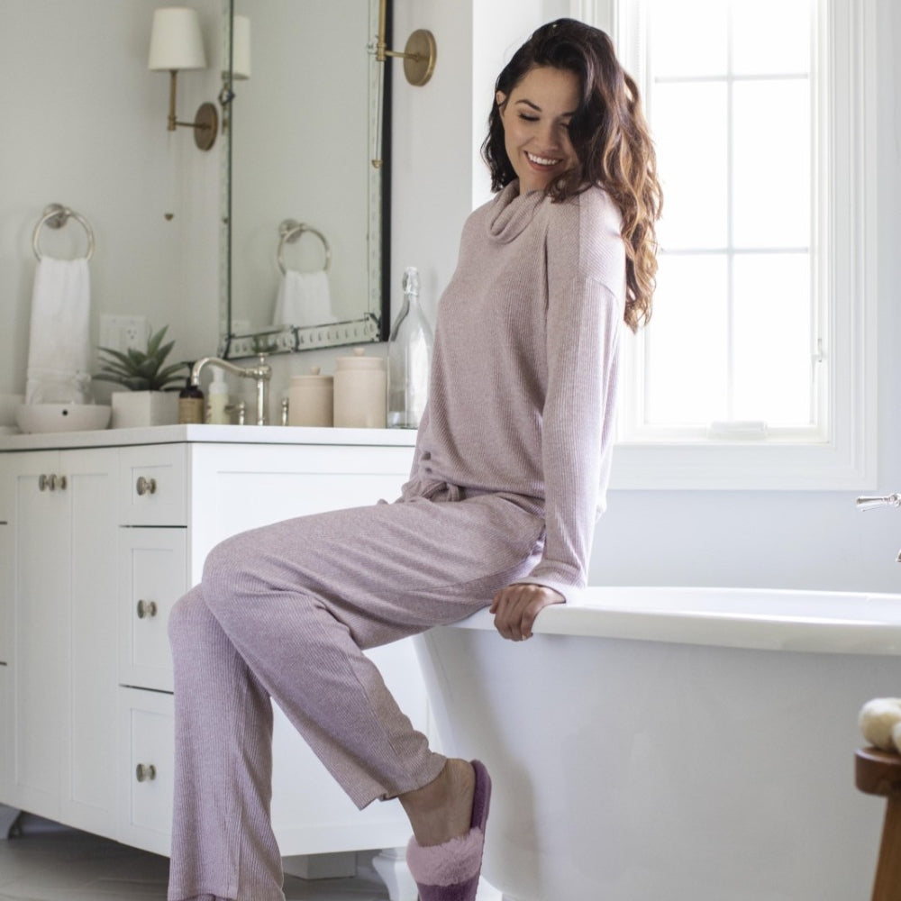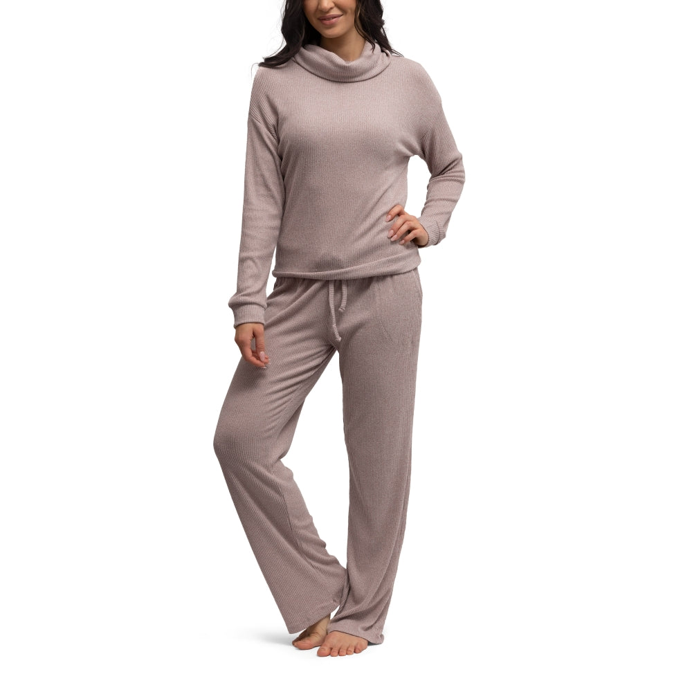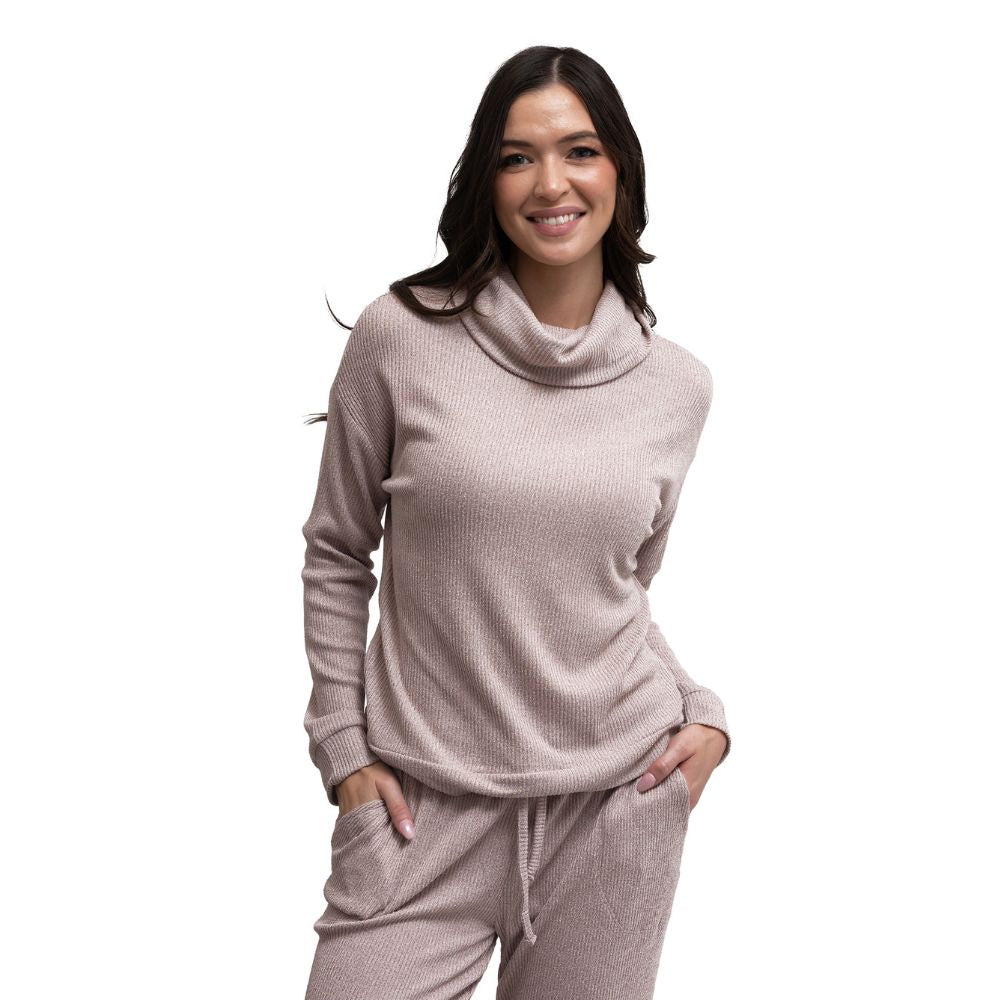 We’ve taken our best-loved CuddleBlend™ rib knit and created the ultimate lounge set. The buttery cowl neck top features a relaxed fit and built-in thumbholes for extra coziness, while the matching wide-leg pants are designed with a comfy elastic waistband, soft drawstring tie, and roomy side pockets. Perfect for lounging at home, traveling in comfort, or styling up for casual days out, this set blends softness with everyday versatility.