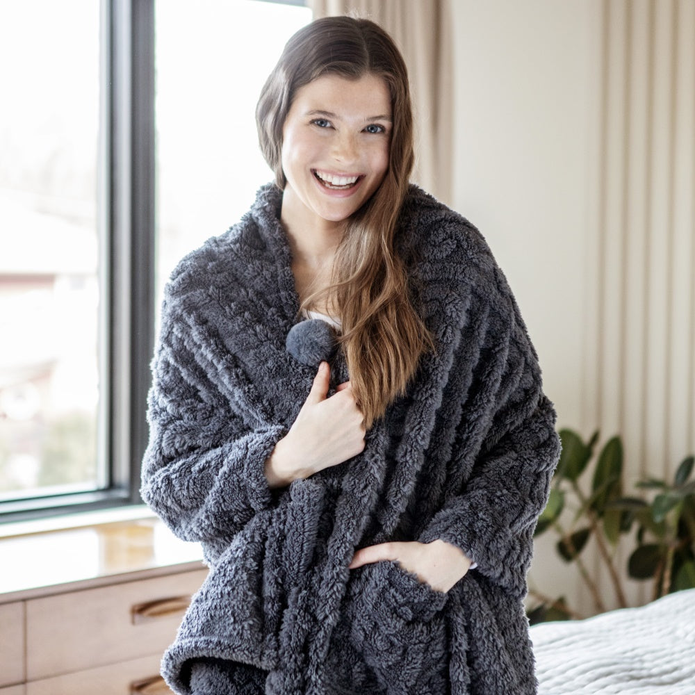 This wearable blanket is the coziest thing you'll ever own. Cuddle up in bed, stay warm on snack runs, and travel anywhere in snuggly comfort. Roll and wrap it for easy packing. Great for office AC!